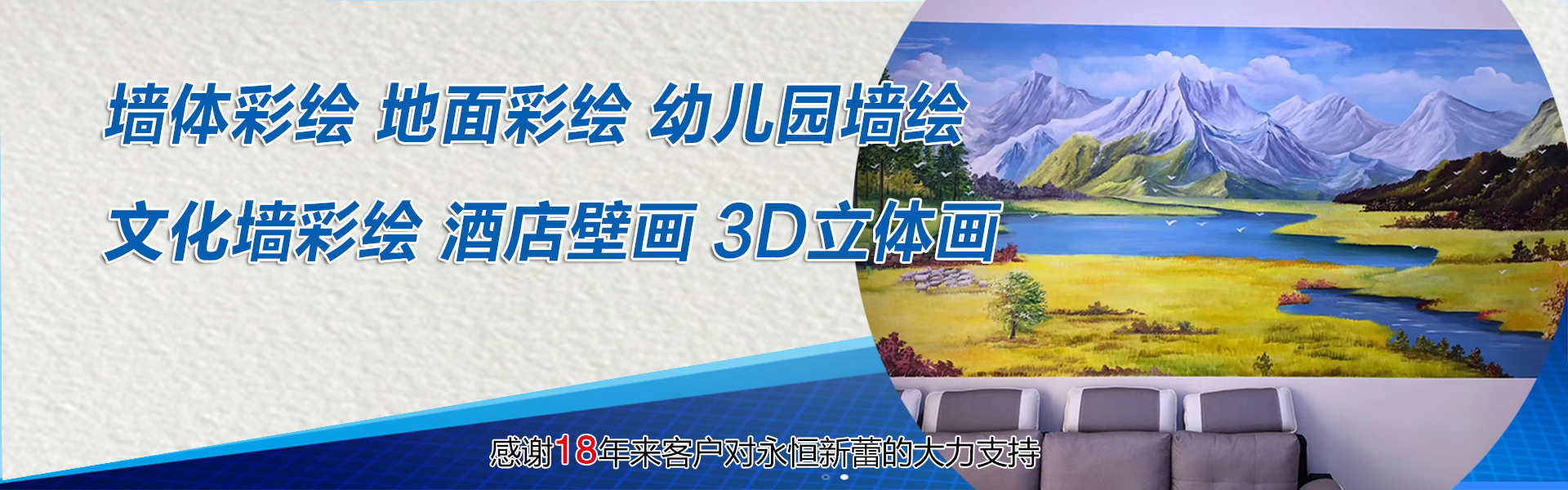 北京永恒新蕾?gòu)V告有限公司是一家專(zhuān)業(yè)從事大型墻體彩繪、文化墻、地面彩繪、手繪壁畫(huà)的設(shè)計(jì)、繪制、施工的專(zhuān)業(yè)綜合藝術(shù)服務(wù)單位。主要承接各類(lèi)大型寺廟空間;文化展覽展示空間;餐飲、娛樂(lè)、家居、公共場(chǎng)所空間的彩繪美化展示等業(yè)務(wù)。