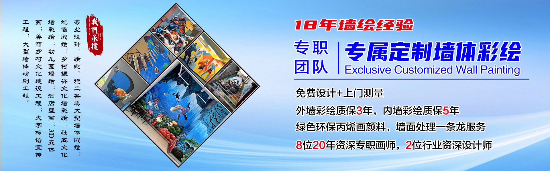 業(yè)務(wù)范圍涵蓋:社區(qū)文化建設(shè)彩繪;校園文化建設(shè)彩繪;各類(lèi)文化墻彩繪;古建彩繪;家居彩繪;幼兒園墻繪;酒店壁畫(huà);3D立體畫(huà);文化街美化工程的建設(shè);美麗鄉(xiāng)村文化建設(shè)工程;房地產(chǎn)圍擋樓盤(pán)展示工程;大字標(biāo)語(yǔ)宣傳工程;浮雕雕塑、門(mén)樓牌樓、噴泉假山等工藝美術(shù)施工工程;各種大型墻體粉刷工程。